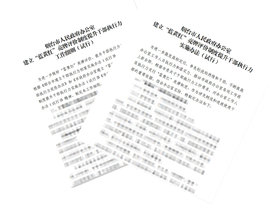 结合实际出台《市政府办公室建立“蓝黄红”亮牌评价制度提升干部执行力实施办法》及《工作细则》,列出17项评价指标,明确评价主体、对象、标准和周期,通过每周工作信息采集、每季度党组评价、季度末亮牌通报等方式,对执行力强,能够积极主动参与急难险重任务、作出突出贡献的,以及优质高效完成工作任务受到表彰奖励、通报表扬的人员,亮蓝牌奖励;对执行力较差,工作拖沓敷衍、推诿扯皮,不能按时保质完成工作任务的人员,亮黄牌警示;对执行力差,工作出现严重滞后、重大失误,给工作造成较大影响的人员,亮红牌警告,努力形成争先创优、干事创业的鲜明导向。